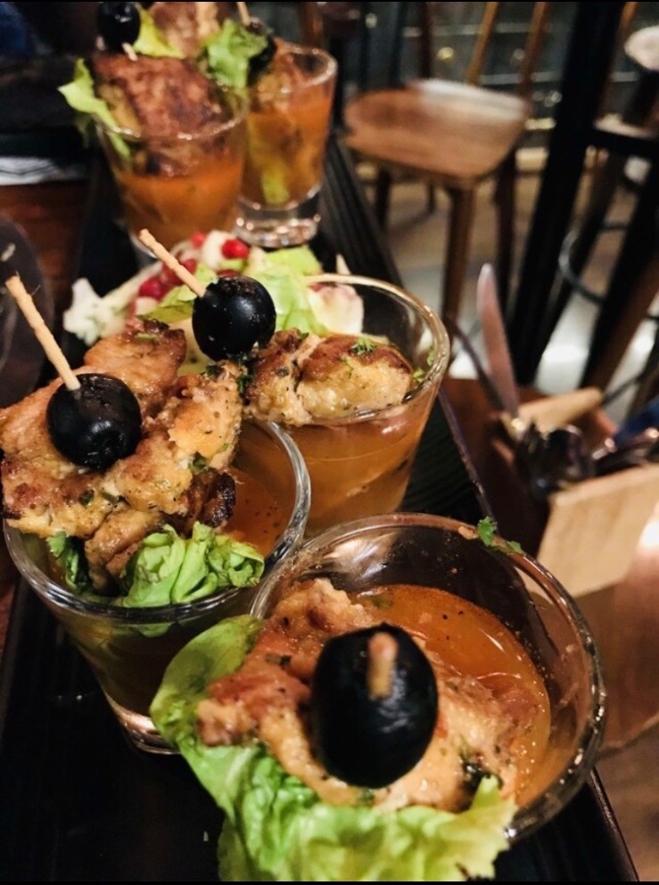 Six shot glasses filled with small cubes of green apple, red apple, cucumber,iceberg lettuce covering a luscious chunk of grilled fish dipped in tomato juice and tabasco. No huge fan of this dish but you’ll surely find a bengali friend if you have one go head over heels for this one.
